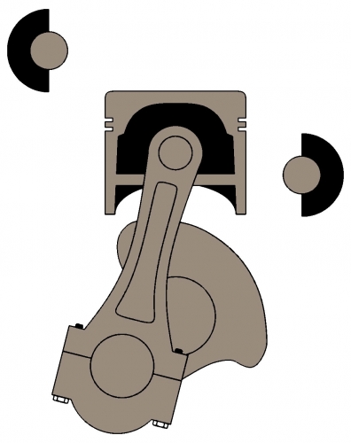 Wałek wyrównoważający (1) obraca się dwa razy szybciej niż wał korbowy (2)
