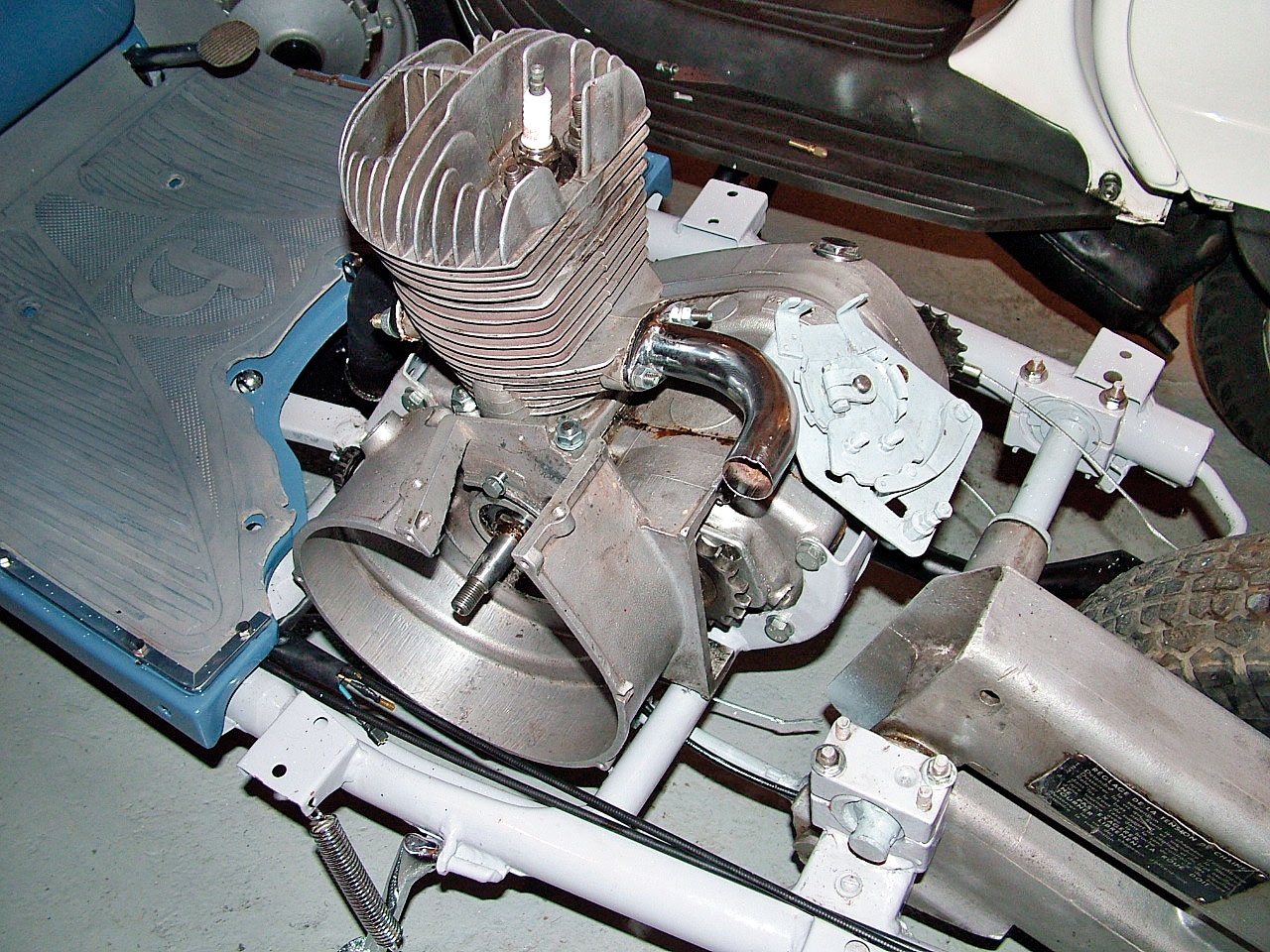 Blok silnika, cylinder i głowica klasycznego skutera Peugeot 157B, oczyszczone metodą chemiczną