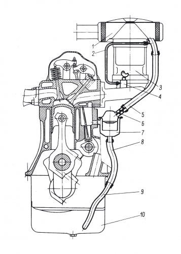 Schemat układu odpowietrzania skrzynki korbowej samochodu Fiat 125p z widocznym odolejaczem, rurką umożliwiającą odpływ oleju z odolejacza do miski olejowej i przewodem odprowadzającym nadmiar ciśnienia i opary do filtra powietrza. 1 – filtr powietrza, 2