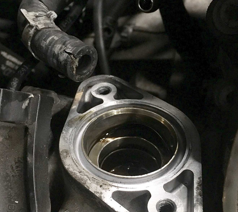 Fot. 3. Pęknięty przewód zasilający pompę wysokiego ciśnienia w silniku 1.8 TFSI. Na zdjęciu widoczne miejsce mocowania pompy, która napędzana jest od krzywki wałka rozrządu zaworów wydechowych