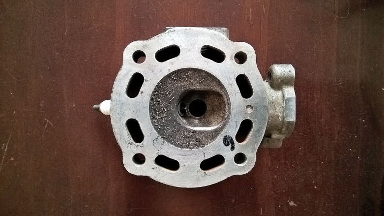 Głowica małego jednocylindrowego silnika motocyklowego z wtryskiem bezpośrednim. Zwraca uwagę dążenie do centralnego umieszczenia elektrod świecy zapłonowej w komorze spalania