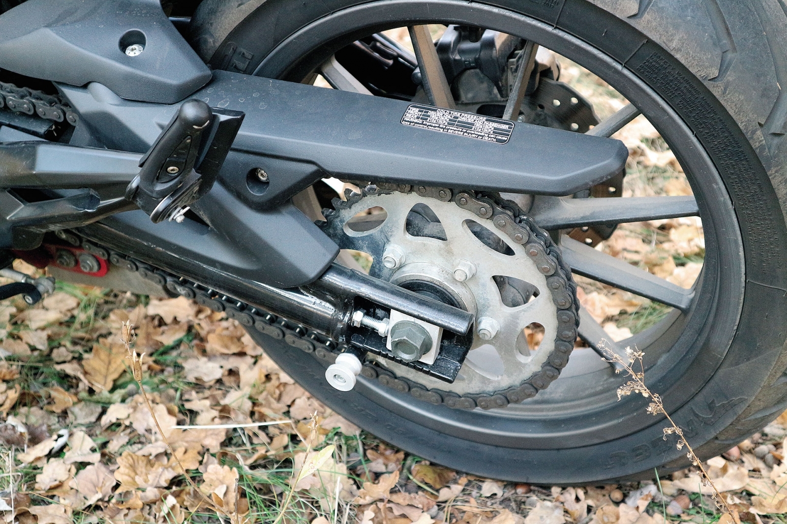 Końcowe przeniesieniu napędu łańcuchem w motocyklu Benelli BN 302. Położenie śrubowego napinacza łańcucha wskazuje na to, że zestaw napędowy jest już trochę zużyty