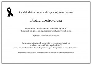 W sobotę w Katowicach odbędzie się pogrzeb PiotraTochowicza, zmarłego przed tygodniem prezesa zarządu Moto-Profil. Początek uroczystości pogrzebowych o godzinie 13.