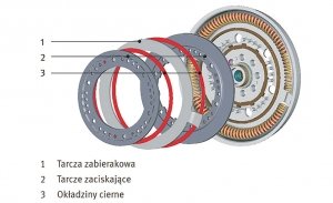 Wewnątrz niektórych kół zamachowych LuK znajduje się sprzęgło zrywne (rys. 1), które zbudowane jest z tarczy zabierakowej (1) i tarcz zaciskających (2, 3) z okładzinami ciernymi....