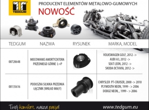 Mocowanie amortyzatora przedniego górnego do pojazdów grupy VW oraz wkład poduszki silnika do samochodów Chrysler, Plymouth i Dodge – to kolejne nowości w ofercie firmy Tedgum....