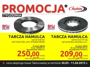 Sieć sprzedaży Autos obniżyła ceny tarcz hamulcowych marki Eku.Promocja trwa od 30 marca do 11 kwietnia br. Szczegóły na załączonej ulotce.
