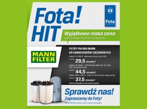 Firma Fota obniżyła ceny filtrów paliwa Mann Filter do samochodów ciężarowych.Promocja trwa od 19 do 23 stycznia br. Szczegóły na załączonej ulotce.