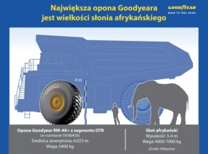 63-calowa obręcz, 4 metry wysokości, 5400 kilogramów – to parametry największej opony Goodyeara. RM-4A+ w rozmiarze 59/80R63 jest wielkości dużego słonia i tyle co on waży!Mowa o ogumieniu OTR do...