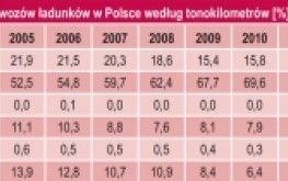 Podstawową gałęzią transportu w Polsce są przewozy drogowe. Według danych GUS samochody ciężarowe w 2011 roku wykonały blisko 70% pracy przewozowej (prawie 219 mld tkm) oraz przewiozły ponad 83% tonażu, to...