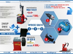 Dokonując w firmie Le-Gum zakupu kompletu montażownica + wyważarka, możemy liczyć na zniżki na inne maszyny lub gratisy w postaci przydatnych w warsztacie narzędzi.Szczegóły promocji na załączonych...