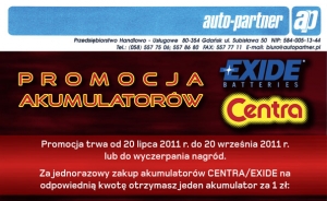 W firmie Auto-Partner - wiodącej hurtowni części samochodowych w województwie pomorskim i w Polsce północnej trwa promocja na zakupy akumulatorów marki Centra. Każdy zakup od 20 lipca do 20 września 2011...