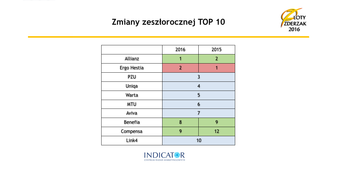 Na ostatecznej „tablicy wyników” doszło do niewielu zmian. Nagroda „Złoty Zderzak” przypadła TU Allianz (ubiegły rok miejsce drugie), a na drugim miejscu uplasowała się Ergo Hestia (ubiegłoroczny zwycięzca). PZU zajęło ostatnie miejsce na podium.
